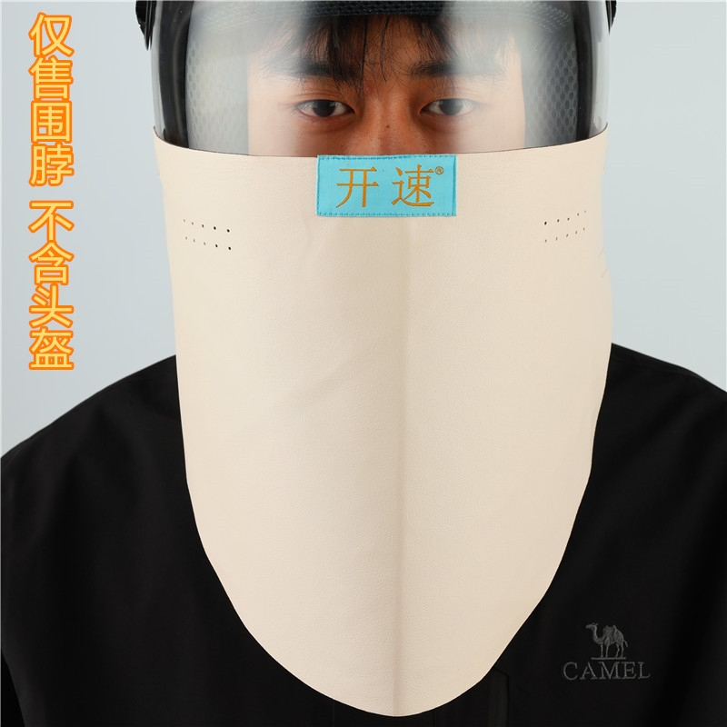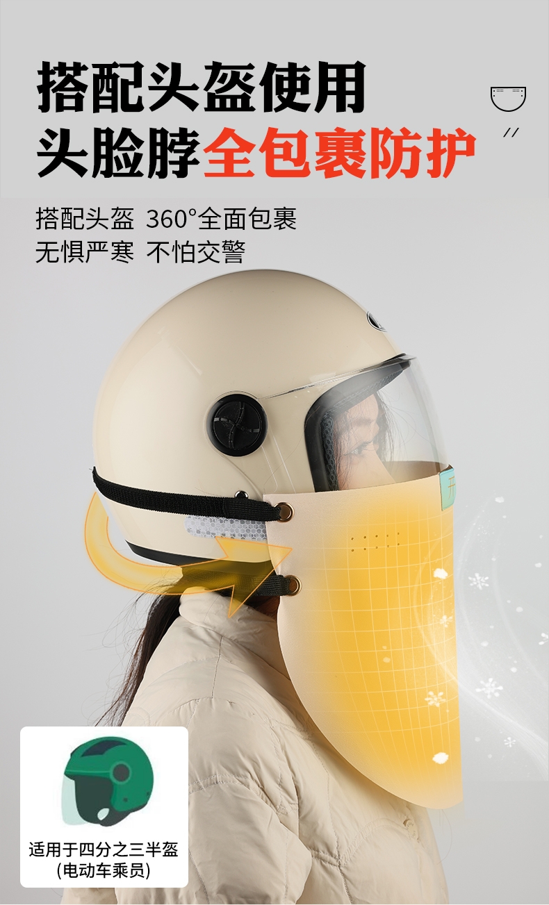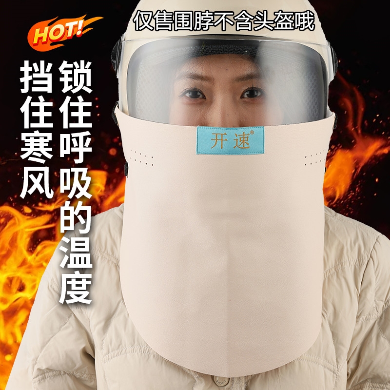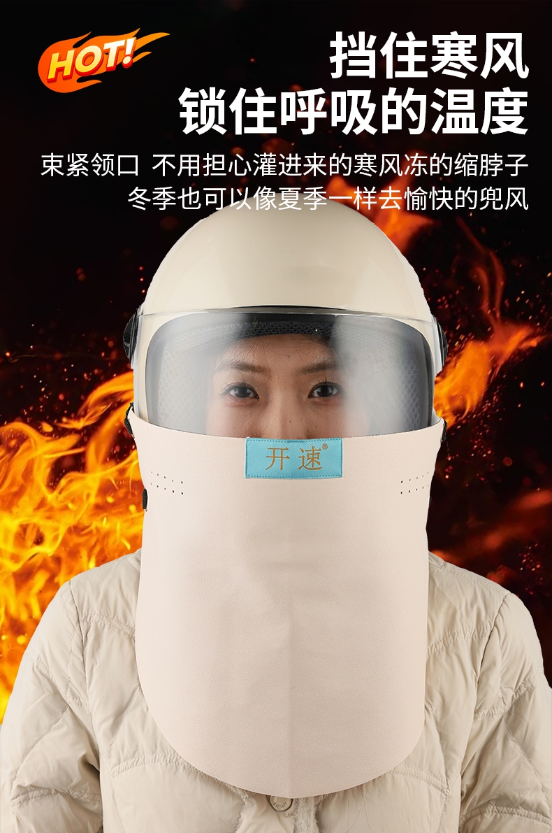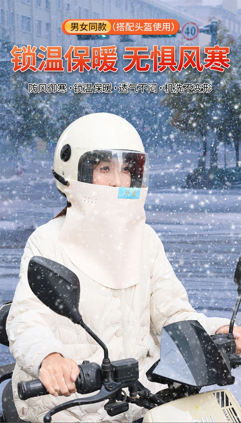 This is a scarf worn on a three-quarters helmet, which functions to: 1. block the cold wind blowing into the helmet along the body during winter and autumn cycling. 2. Rain and snow resistance. 3. There are twenty ventilation holes on both sides of the scarf, which allow for a weak circulation of air inside the helmet during cycling and can automatically remove fog.