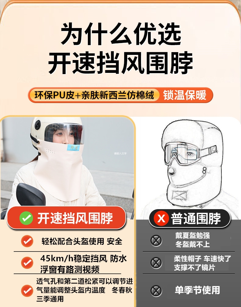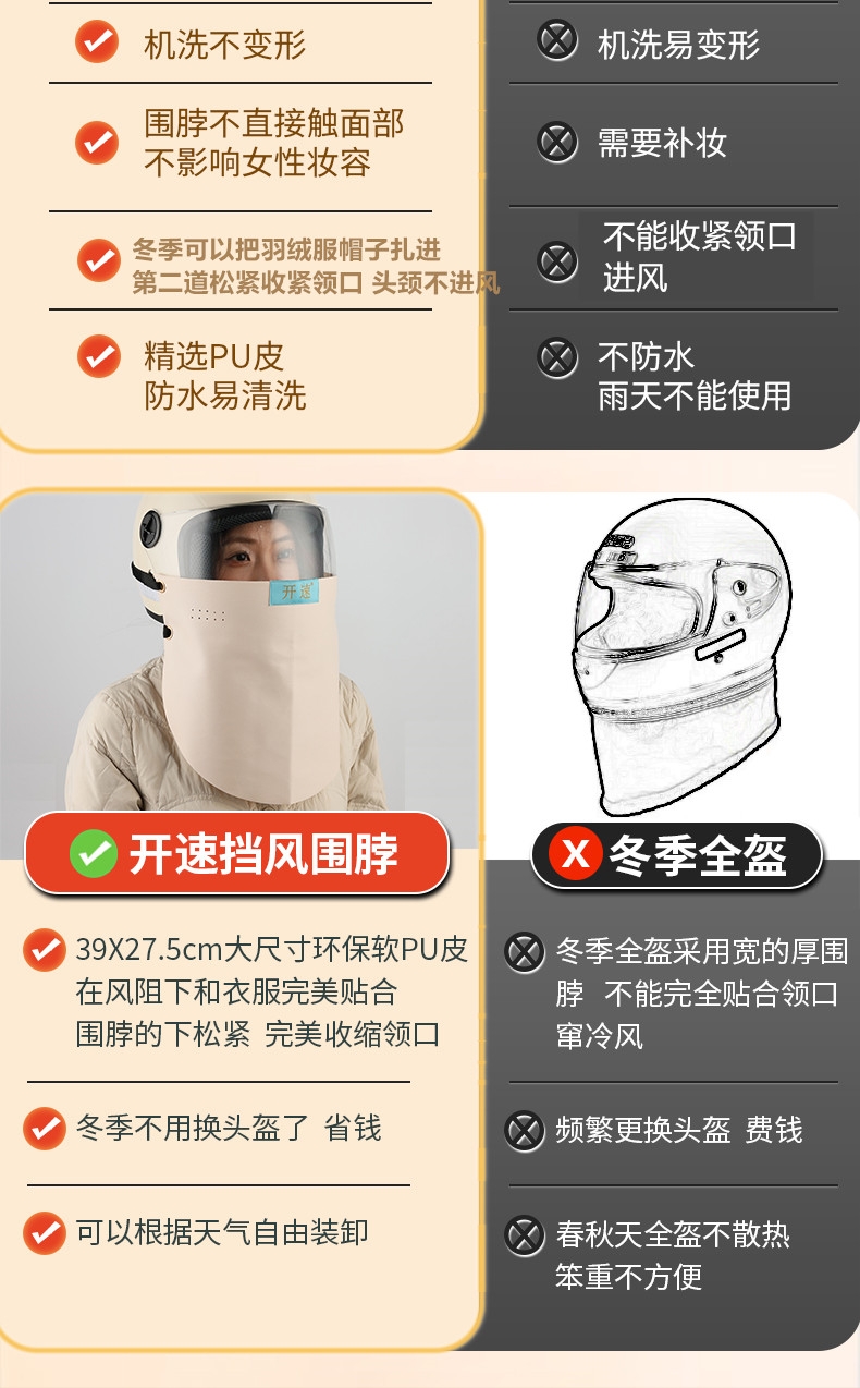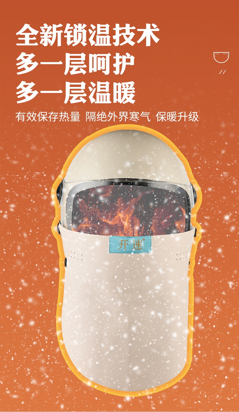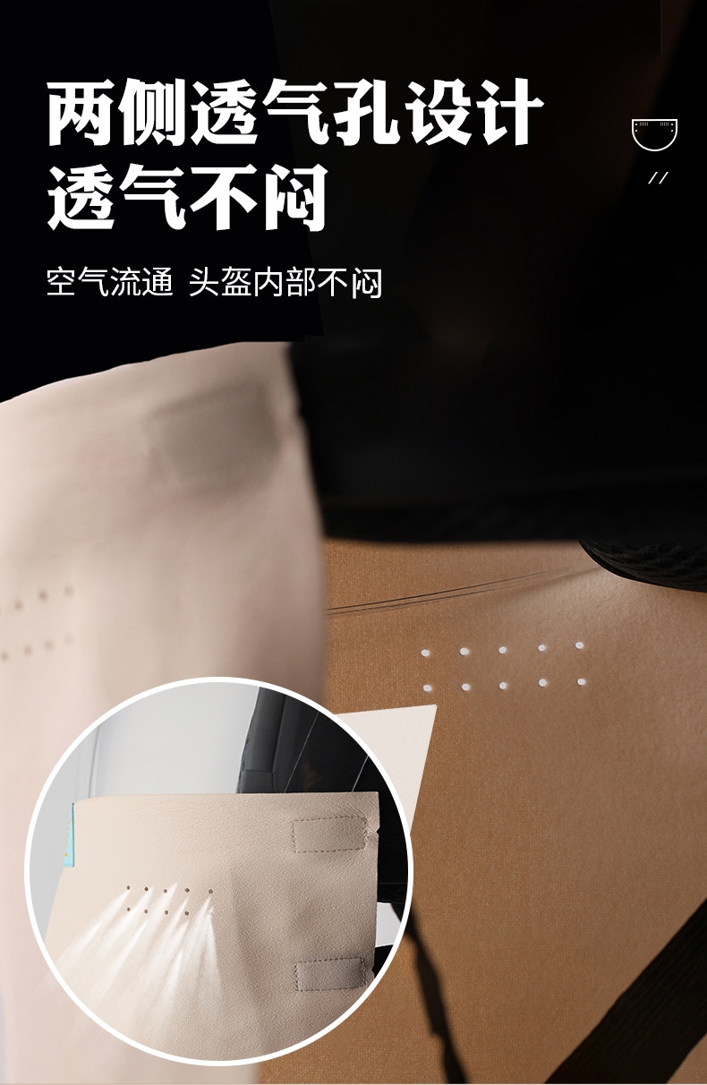 This is a scarf worn on a three-quarters helmet, which functions to: 1. block the cold wind blowing into the helmet along the body during winter and autumn cycling. 2. Rain and snow resistance. 3. There are twenty ventilation holes on both sides of the scarf, which allow for a weak circulation of air inside the helmet during cycling and can automatically remove fog.